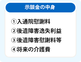 高次脳機能障害で5級が認定された場合の示談金の項目には、①入通院慰謝料、②後遺障害逸失利益、③後遺障害慰謝料等があります。また、④将来の介護費が認められる可能性もあります。。
